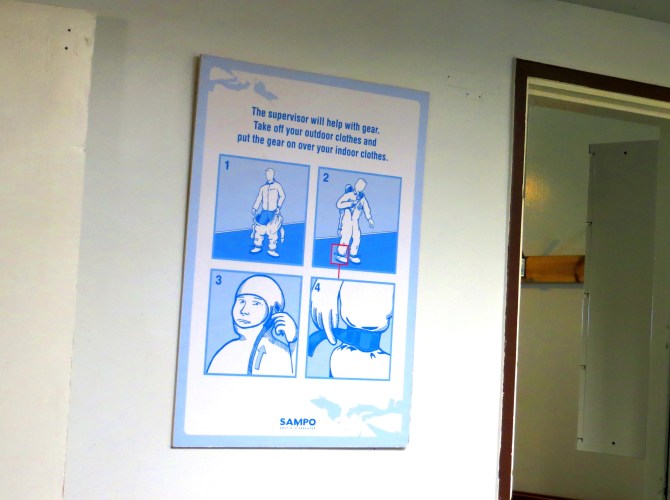 Step 5:  Following the handy instruction chart posted on the wall, take off your outerwear, putting your suit on over your clothing. Now you are ready to go!