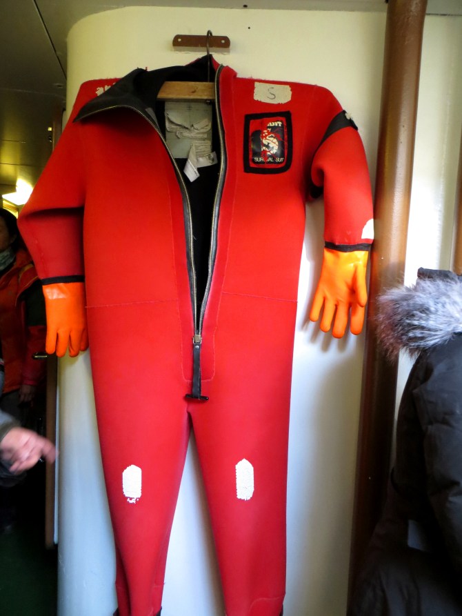 Step 4. While the ship is cutting through meters of ice, look for the stash of Arctic-rated survival suits….probably located in the lower section of the ship.  These survival suits enable its wearer a greater chance of survival if they unfortunately ended up falling into the cold artic sea.  The suit provides insulation, floatation, and water protection in the event of an emergency. Don’t get me wrong- these do not provide much warmth but prevent hypothermia for up to 6 hours and in some cases longer. But they will do for a casual swim!
